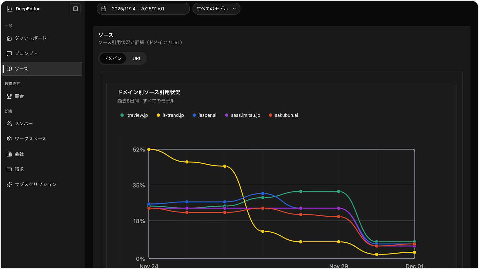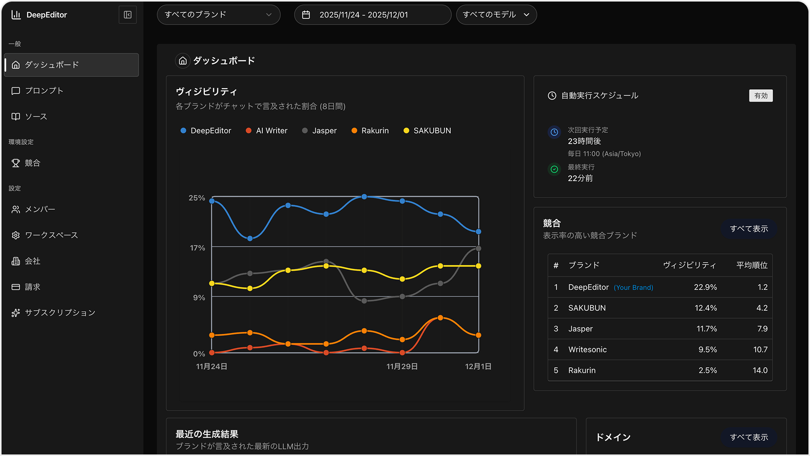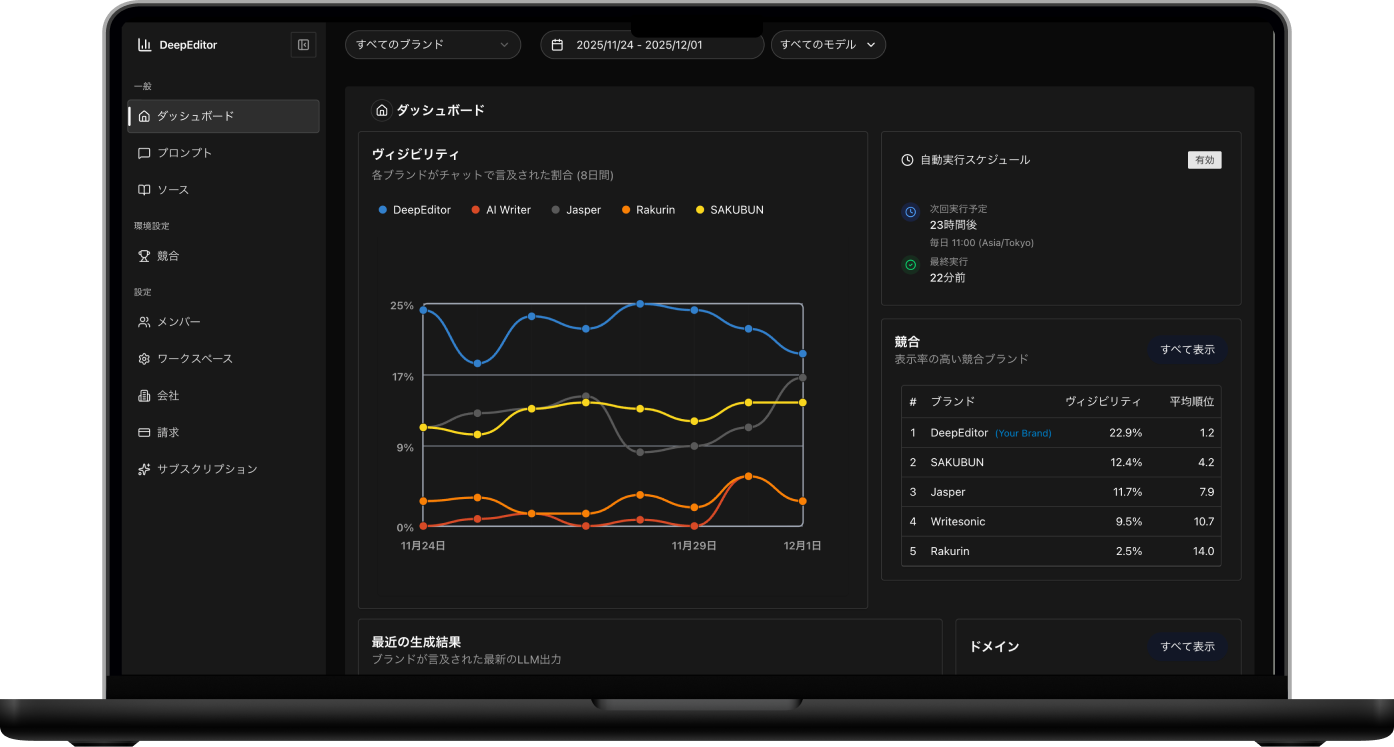 - LLMが生成する回答内容、ブランドの言及頻度、回答順位などを数値とテキストで分析・比較できます。