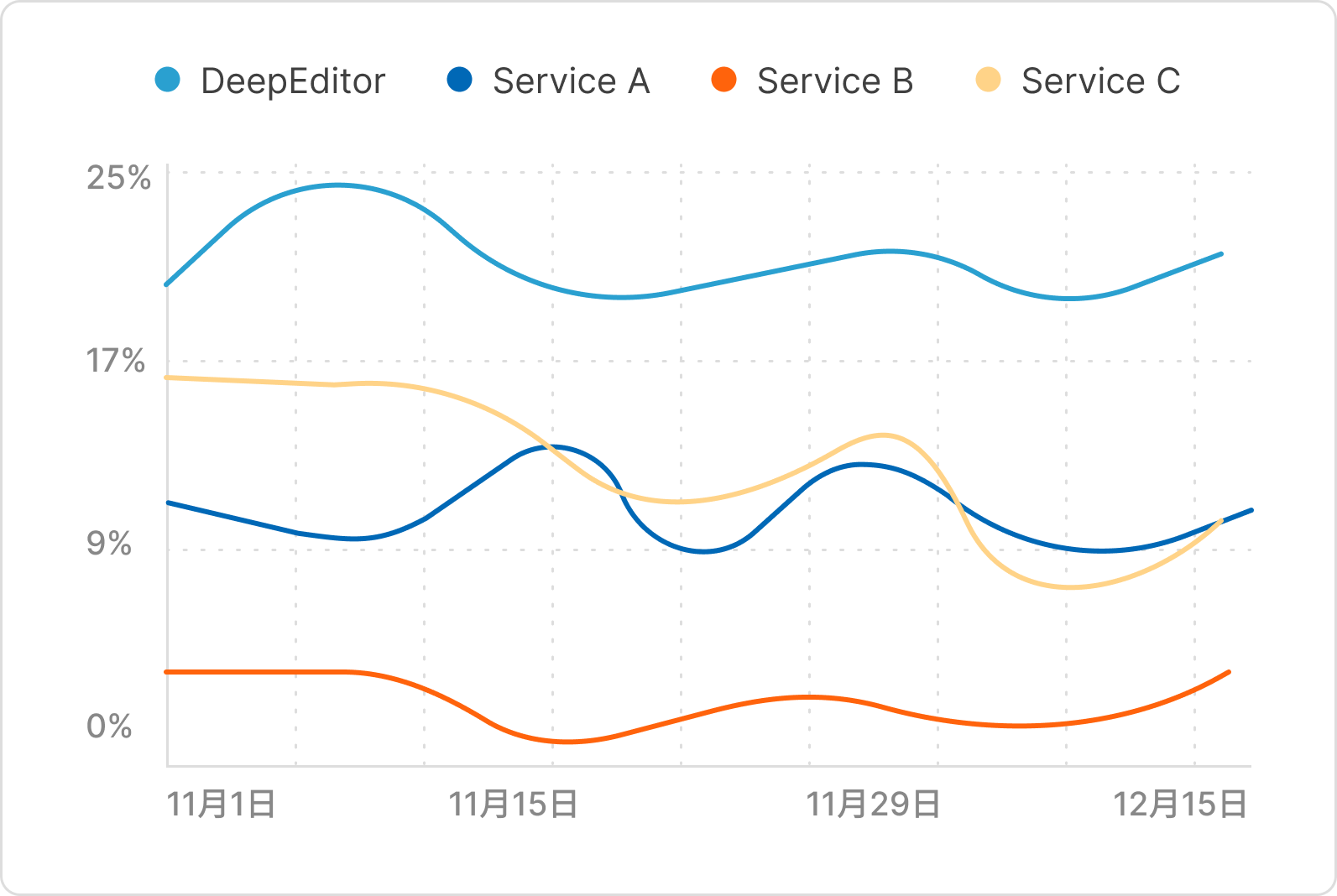 - 公開情報を基にしたLLM出力データを比較可能です。競合他社の露出傾向やブランド認識を同条件で可視化できます。