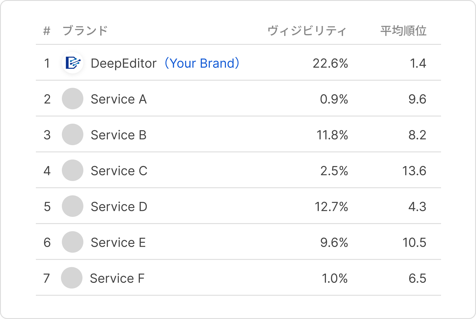 自社のブランドがLLMで何番目に言及されているかを把握。より上位を狙うための改善ポイントを見つけましょう。
