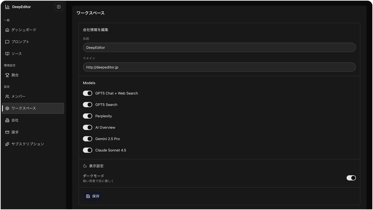 - ChatGPT、Gemini、AIO、Claude、Perplexityなど主要なLLMを中心に対応しています。今後も新しいモデルを順次追加予定です。